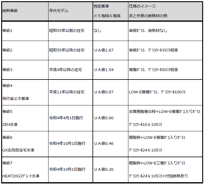 断熱等級1から7までの指標とイメージを表にしてまとめました。