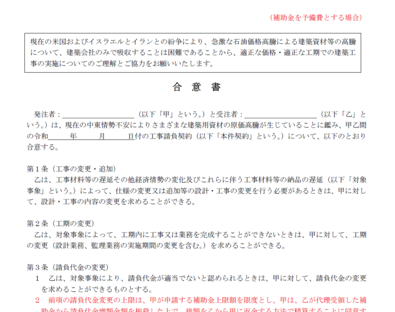 急激な石油価格高騰による建築資材等の高騰について、建築会社のみで吸収することは困難であるとして、請負業者が必要と判断した場合は請負契約後でも請負代金を変更が可能であること、追加請求できる金額は青天井ではなく補助金額を上限とする合意書サンプルです。使用にあたっては必ず利用者ご自身の責任において、関係機関への確認や専門家への相談を行って使用してください。